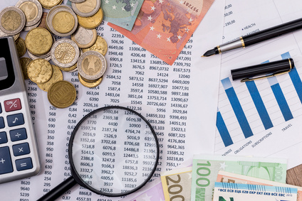 Budget text with magnifying , 100 euros, calculator, pen with coins
